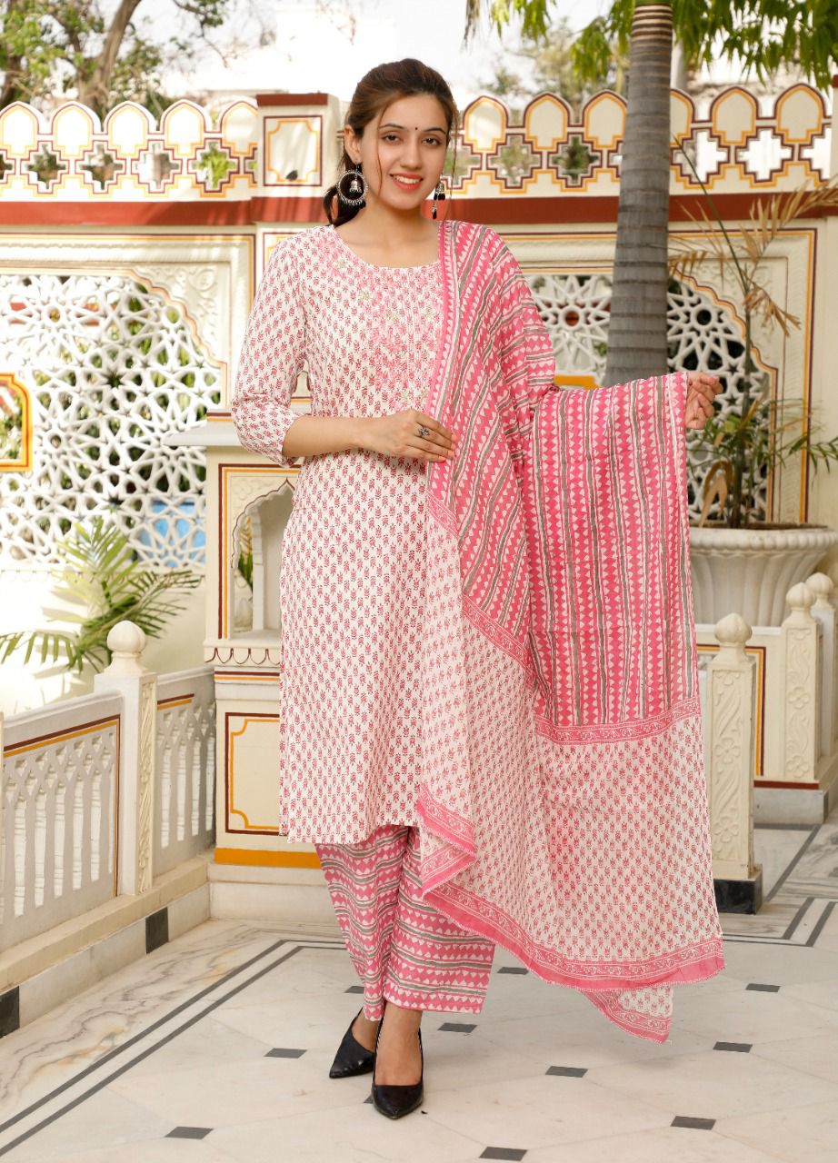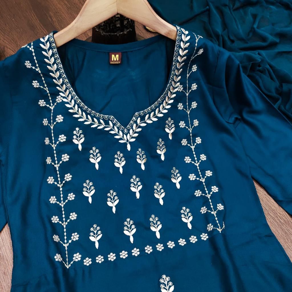Beautifully handcrafted, hand-screened Rayon kurta set. The printed kurta comes with palazzo pants and a elegant dupatta. With the captivating color of this kurta set.